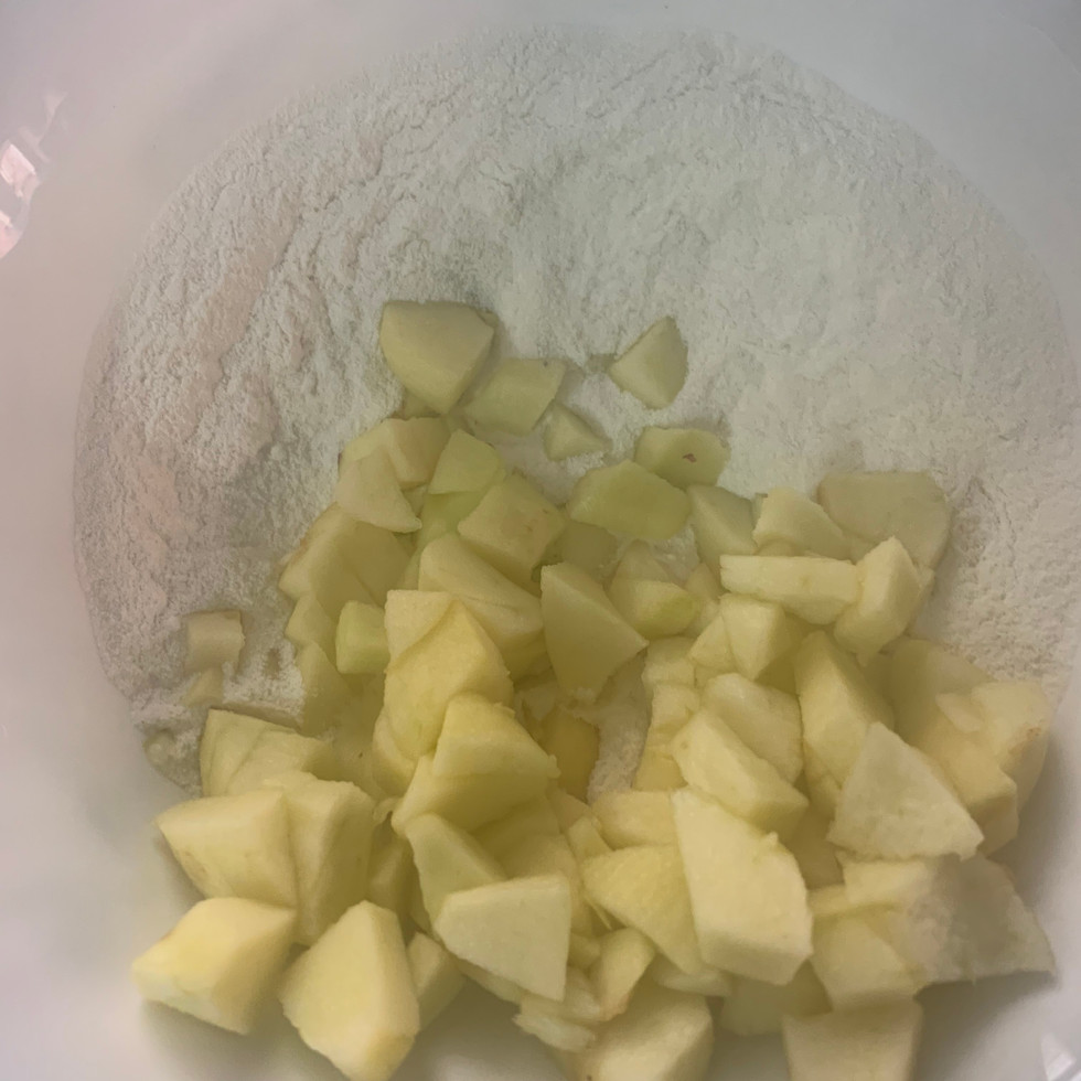 Add the peeled and cubed apple into dry ingredients first. If you won't coat apple with dry ingredients they will sink to the bottom. So this step is IMPORTANT.