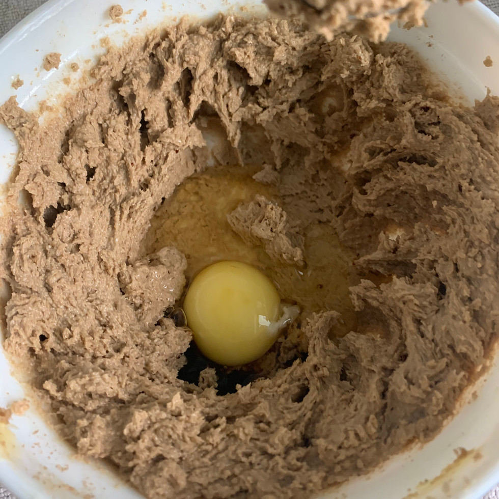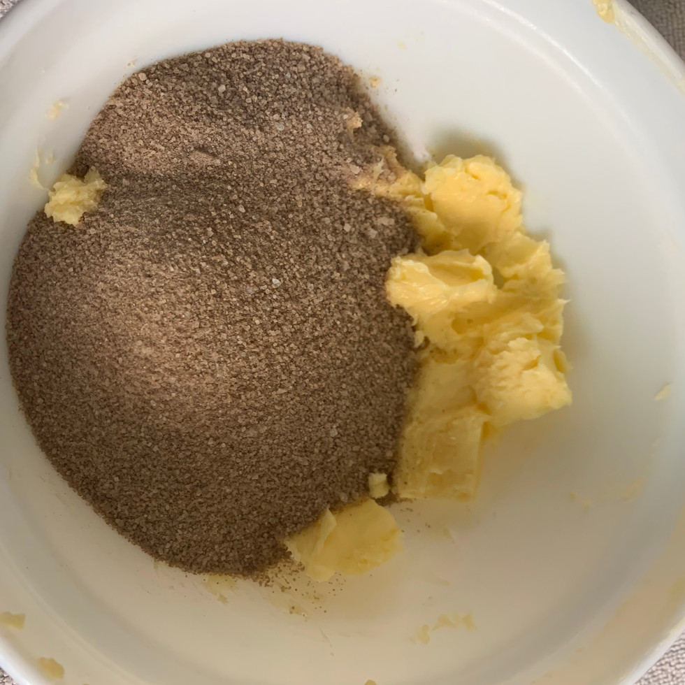In a bowl add your room temp butter and finely powdered brown sugar. Using a stand mixer or hand beater beat the butter and sugar for 2-3 min. This will lighten the colour of the mix and adds air in the mix.