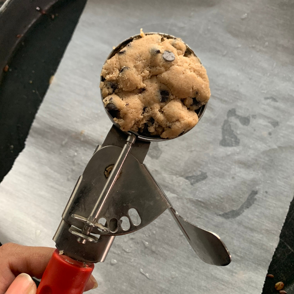 Preheat your oven at 180C for 10 min. Spoon out 2 tbsp or 1 small ice cream dough (50-55 gm)onto the sheet and put some more chocolate chips on top before baking. Bake your cookies at 180C for 15-18 min until sides change a bit of colour and centre is still soft. Let cookies rest for 10-15min before trying them out otherwise they will not hold shape.
